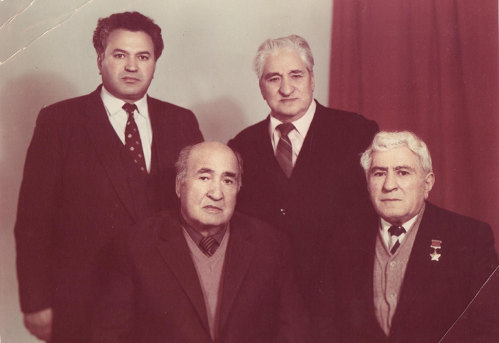 На снимке: стоя, слева – проф. К.И. Мирзоев, справа — курдский востоковед, общ. деятель проф. Х.М. Чатоев; сидя, слева – курдский историк и писатель Н.Х. Махмудов и герой Советского союза Саманд Алиевич Сиабандов.