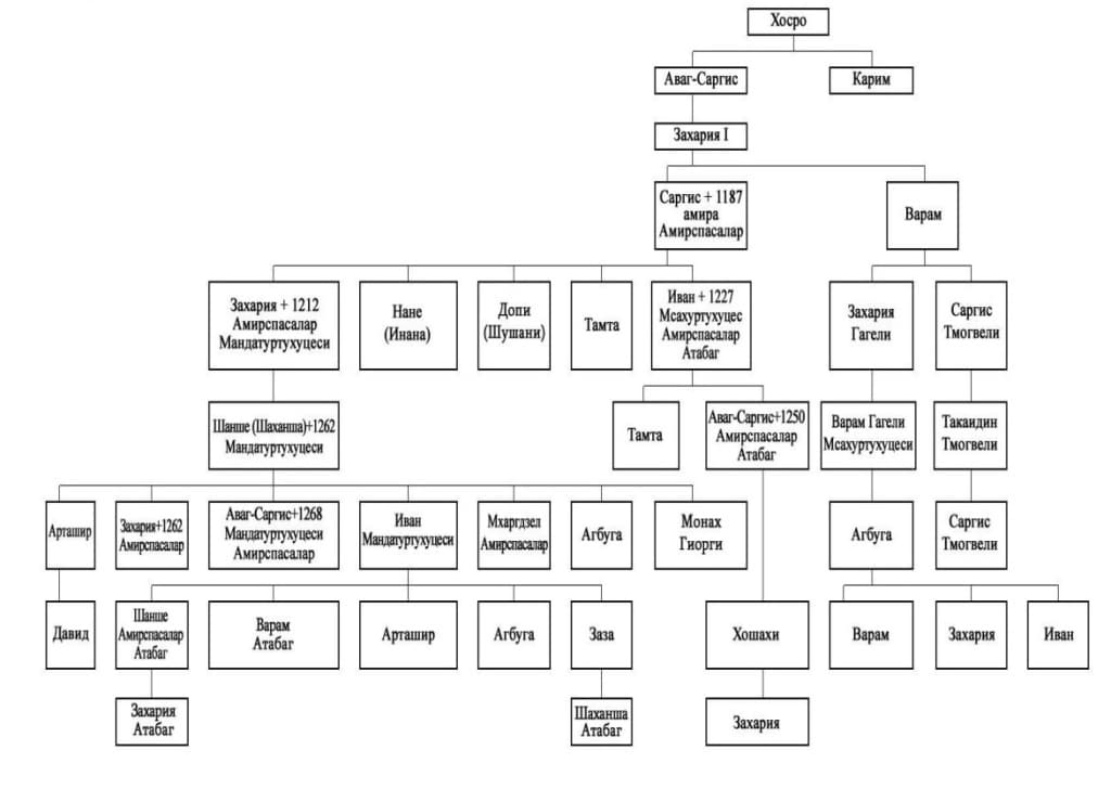 Орбели, и по этой причине в 1177 году они принимали участие в восстании царевича Демны, но через некоторое время Саргис Мхаргрдзели с сыном Захарией и племянниками вместе другими князьями оставили лагерь восставших, принесли покаяние перед царём Георгием III и присоединились к нему, что и было по достоинству оценено царём180. После демарша Кутли-Арслана и его сторонников, начинается продвижение рода Мхаргрдзели ко многим высоким должностям государства. В то же время около 1190–1191 гг. после кончины амирспасалара Гамрекел-Торели, св. царица Тамара жалует Саргис Варамовичу Мхаргрдзели должность амирспасалара и крепость Тмогви181. Также Саргис владел Джавахети и вместе с разными ветвями рода Торели были приграничным хранителем этой области Грузинского царства182. В то же время, к 1191 году формируется Гагское пограничное саэриставо (воеводство) и им управляют Гагел-Мхаегрдзели183. К концу XII века род Мхаргрдзели разделился на три ветви. Это основная ветвь Мхаргрдзели, а также, Мхаргрдзел-Гагели184 и Мхаргрдзел-Тмогвели, ну а позже, основная ветвь в свою очередь также поделилась на дома Захарий и Иване Мхаргрдзели. Каждая из них была уважаема за заслуги и знатность, но в первой половине XIII века особенно почитались представители рода Саргиса I амирспасалара и Варама185, а впоследствии и род Мхаргрдзел-Тмогвели, с которыми и связан монастырь Ваханских пещер и Типик этого монастыря. Чтобы лучше понимать вопросы, связанные с этой ветвью рода Мхаргрдзели, ниже, в приложении, мы приводим часть схемы, составленной академиком Ш. Месхия и посвященной генеалогии рода Мхаргрдзели.