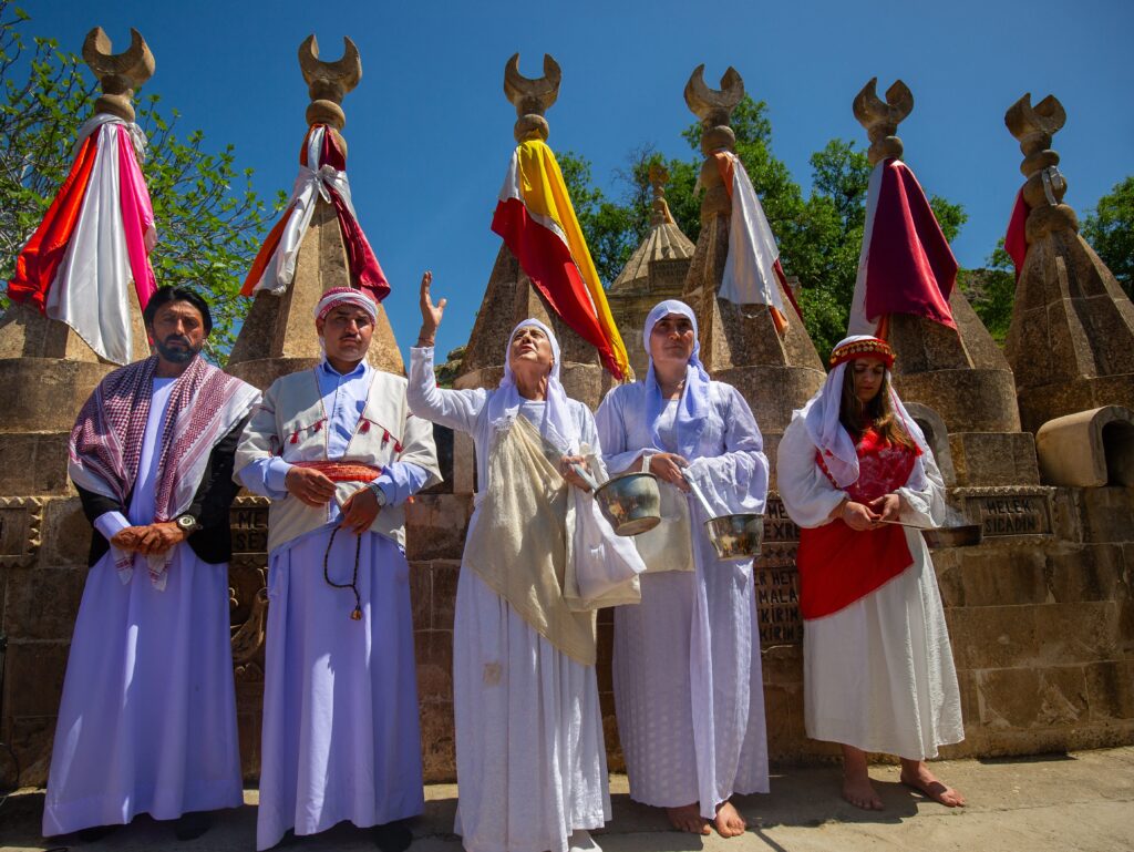 SIRNAK, TURKIYE - APRIL 18: Yazidis, dressed in colorful clothes, visit their cemeteries and perform rituals to celebrate the Red Wednesday Feast, the Yazidi New Year at the village of Magara in Idil district of Sirnak, Turkiye on April 18, 2024. Mustafa Kilic / Anadolu (Photo by Mustafa Kilic / ANADOLU / Anadolu via AFP)